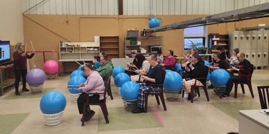 Our drumline is an energetic cardio class designed to get you moving! You will use drumsticks to hit a fit ball in time to the dance music being played. Our chair exercises will also help with your cardio and strength training, all while having a blast!