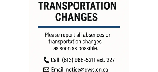Absences or Transportation Changes. If you need to inform staff and management about absences or transportation changes, please email notice@qvss.on.ca or call (613) 968-5211 ext. 227 and leave a message. A quick phone call or email makes a huge difference! Thanks, everyone!